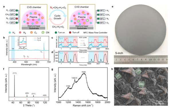 Here, the HKU–USTB team developed a customized microwave plasma-enhanced chemical vapor deposition (MPCVD) system and introduced an innovative high-frequency pulsed nitrogen doping strategy, creating a rapidly switching local non-equilibrium growth environment during diamond deposition. By precisely controlling plasma chemistry and growth conditions, the team successfully produced a 5-inch free-standing diamond wafer. By alternately introducing a nitrogen source at high frequency in the plasma, the composition of the plasma active species and the growth temperature continuously fluctuate within an extremely short period, thereby breaking the limitations of traditional stable growth modes. This dynamic regulation mechanism not only enhances the processes of surface reconstruction and defect control but also effectively promotes the formation of specific microstructures. As a result, diamond can maintain high purity and high density while enabling the fabrication of ultra-hard diamond wafers with diameters up to several inches, providing a new technical pathway for the scalable growth of large-sized ultra-hard materials.