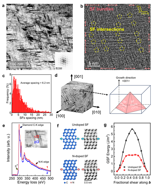 Figure 3 Microscopic structure and hardening mechanism of high-density stacking-fault diamond.