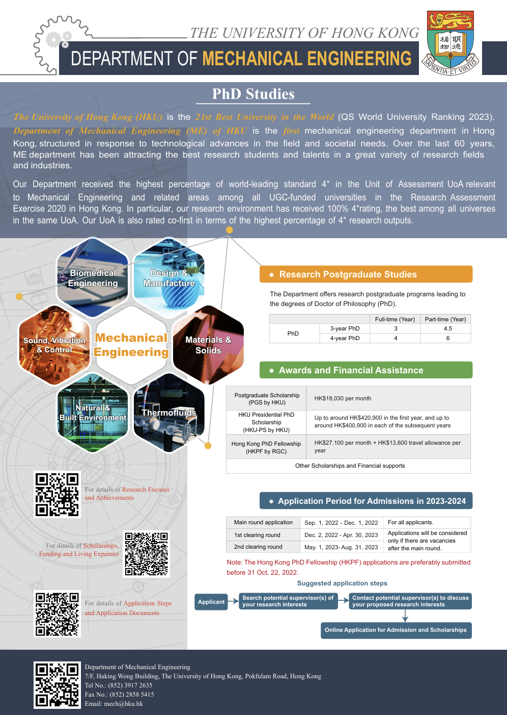 Candidates normally conduct research work under the supervision of at least one member of the Department’s teaching staff. Candidates without a research Master’s degree will be considered for admission to a 4-year PhD program, and those who hold research Master’s degrees will be considered for admission to a 3-year PhD program. Candidates for the research degrees of MPhil and 4-year PhD will be required to follow an approved course of study and research, including coursework. The objective of the coursework component is to aid research work and preparation for writing the thesis.